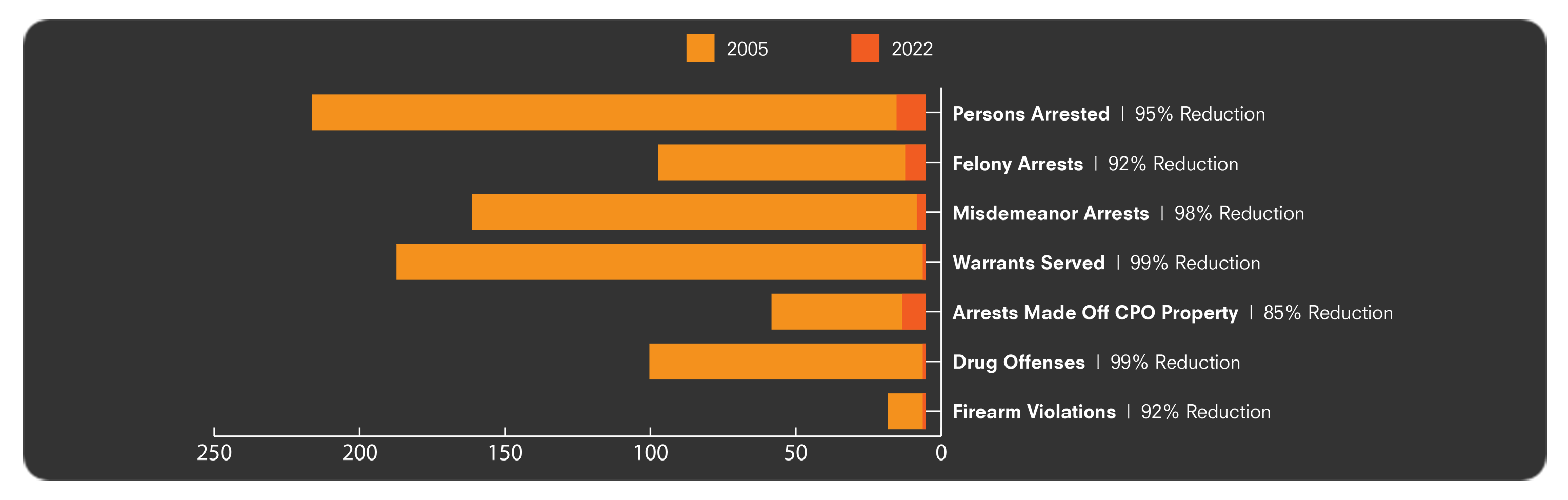 Arrests by CPO officers have decreased 95% between 2005 and 2022. More importantly, children have resumed playing in courtyards and backyards in our neighborhoods.